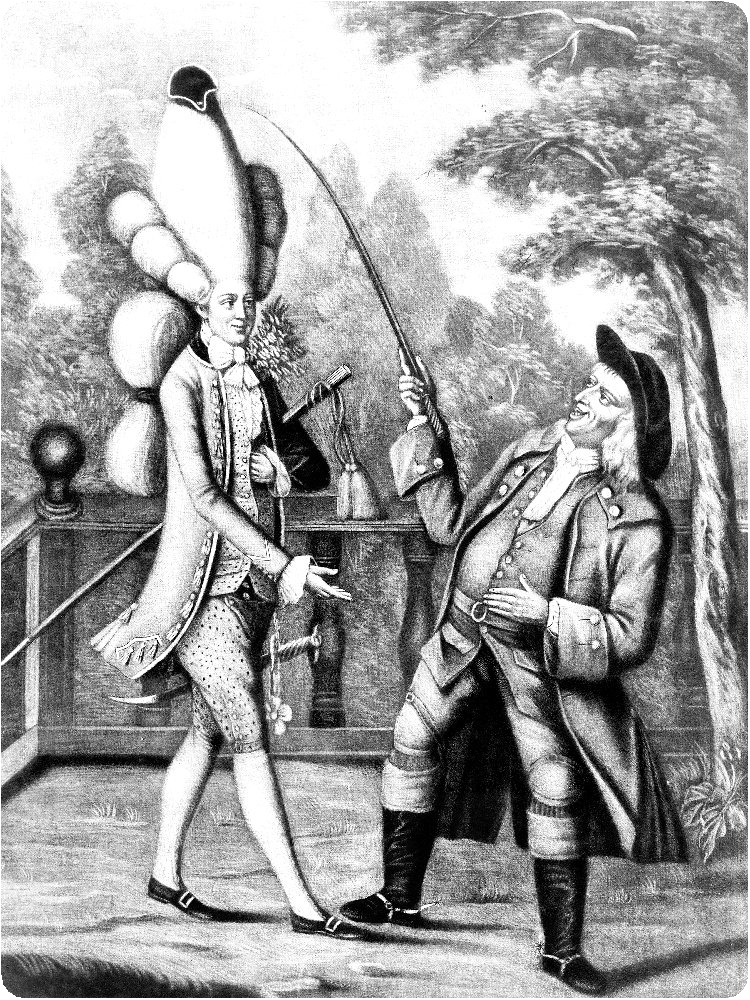 フランス風に頭を盛り上げ、化粧をして帰ってきた息子の姿に仰天している父親の風刺画。